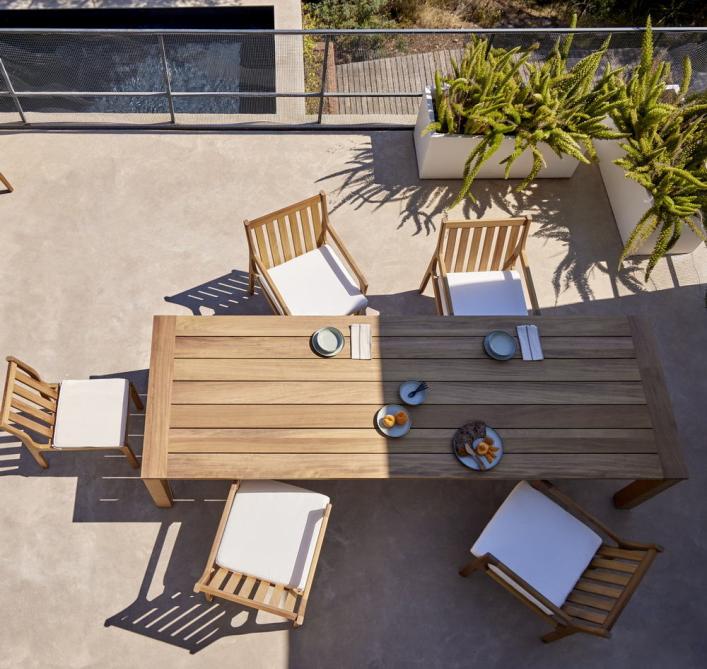 Mobilier eco responsable fabriqué en iroko massif de première qualité, pour l'entretien utiliser un chiffon doux humidifié avec de l’eau et un produit nettoyant non abrasif, Tout bois massif exposé en extérieur change d’aspect et de couleur ce qui n’altère en rien sa qualité. Nécessite un entretien régulier.