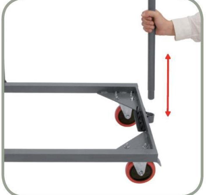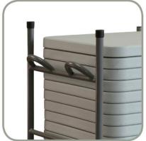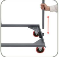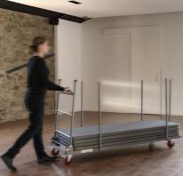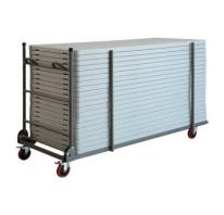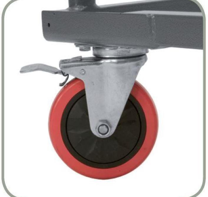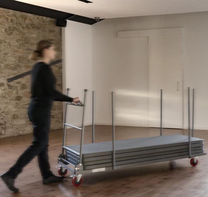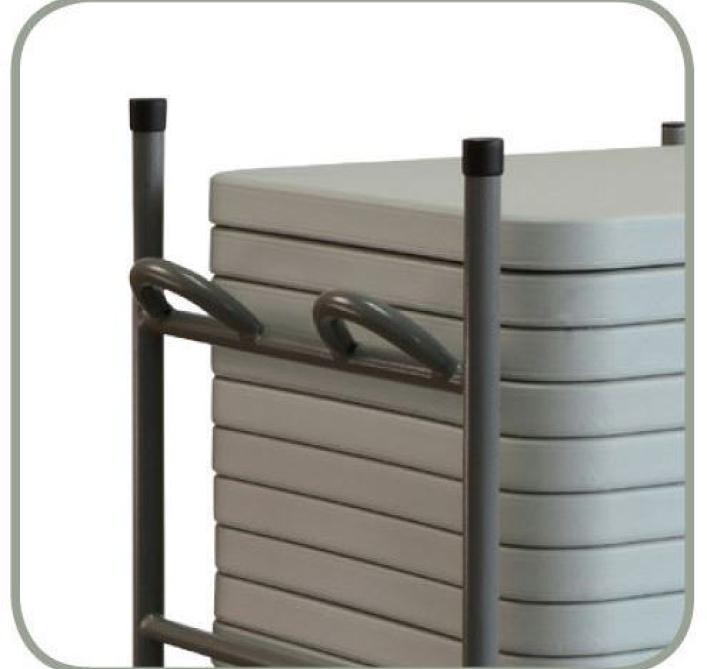 Poteaux périmétraux pour immobilisation des tables empilées et anse spécialement conçue pour protéger les mains. Barre avec mécanisme automatique pour blocage et déblocage et pour permettre le pliage du support vertical. Tous les composants sont intégrés pour ne pas les perdre.4 roulettes en polyuréthane avec frein intégré. (2 roulettes fixes et 2 roulettes pivotantes)., Durable, compétitif et nécessitant peu d’entretien