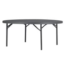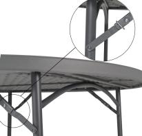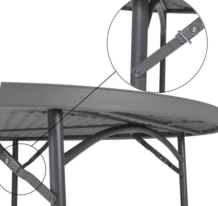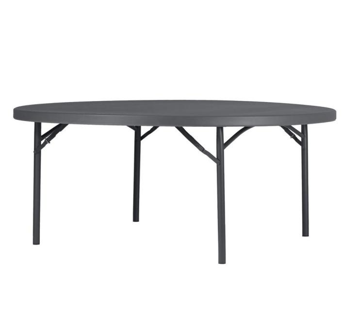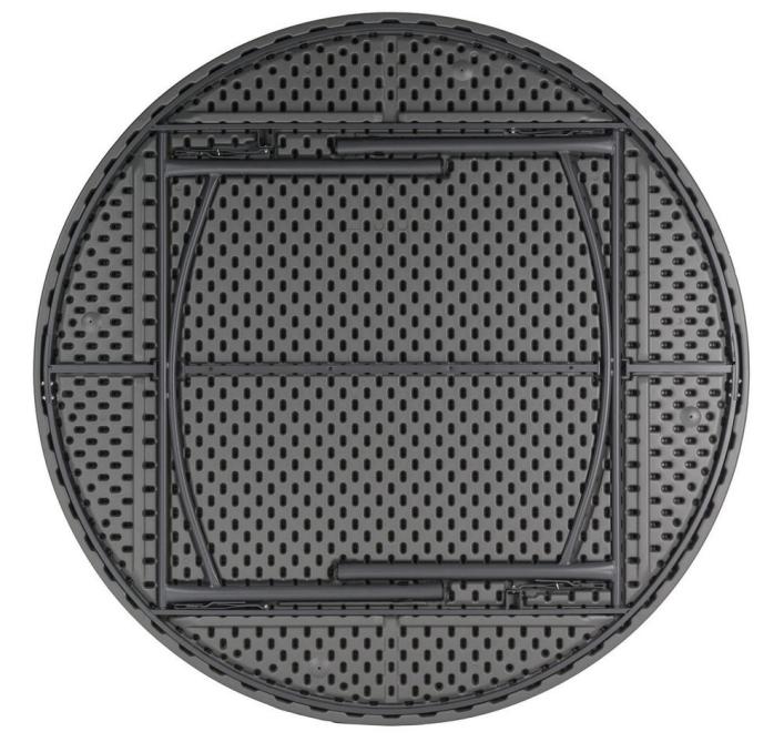 Table ronde pliante avec structure d’acier peint par pulvérisation de couleur grise foncée bleutée. Dimensions: Ø180.3 x H74.3 cm Plateau en polyéthylène haute densité. Embouts des pieds intégrés. . Nouveau mécanisme de blocage manuel au maniement très doux et anneaux autoglissants de sécurité inclus pour éviter le pliage involontaire. Capacité pour 10 personnes assises. Chariot PlanetTrolley disponible avec capacité pour 13 tables. , Léger et résistant en cas de choc Stable et apte à supporter des charges lourdes Durable, compétitif et nécessitant peu d’entretien Rapide et sûr pour être monté et démonté fréquemment Facile à transporter et à stocker en économisant de l’espace Fabriqué à base de matériaux hygiéniques et faciles à nettoyer Protection UV et hydrofuge. Idéal pour une utilisation extérieure prolongée mais non permanente ni en conditions extrêmes (en particulier humidité ou haute salinité). Stockez le produit en position droite, sans l’exposer à la pression d’autres objets qui risqueraient de le déformer, Plateau : 100% Polyethiléne haut densité Structure en acier peint par pulvérisation.