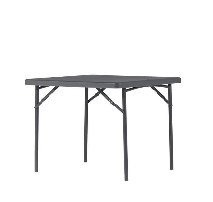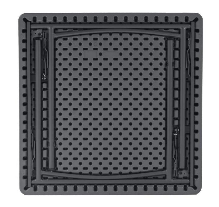 Table pliante de couleur grise foncée bleutée avec un plateau en polyéthylène de haute densité 100% pur. Dimensions: 91.4 x 91.4 x H74.3 cm Capacité pour 4 personnes assises. Ergonomique, confort total aussi pour les personnes situées en bout de table. Nouveau mécanisme de blocage manuel au maniement très doux et anneaux autoglissants de sécurité inclus. Embouts des pieds intégrés. Chariot XXLTrolley disponible avec capacité pour 28 tables. , Léger et résistant en cas de choc Stable et apte à supporter des charges lourdes Durable, compétitif et nécessitant peu d’entretien Rapide et sûr pour être monté et démonté fréquemment Facile à transporter et à stocker en économisant de l’espace Fabriqué à base de matériaux hygiéniques et faciles à nettoyer Protection UV et hydrofuge. Idéal pour une utilisation extérieure prolongée mais non permanente ni en conditions extrêmes (en particulier humidité ou haute salinité). Stockez le produit en position droite, sans l’exposer à la pression d’autres objets qui risqueraient de le déformer, Plateau : 100% Polyethiléne haut densité Structure en acier peint par pulvérisation.